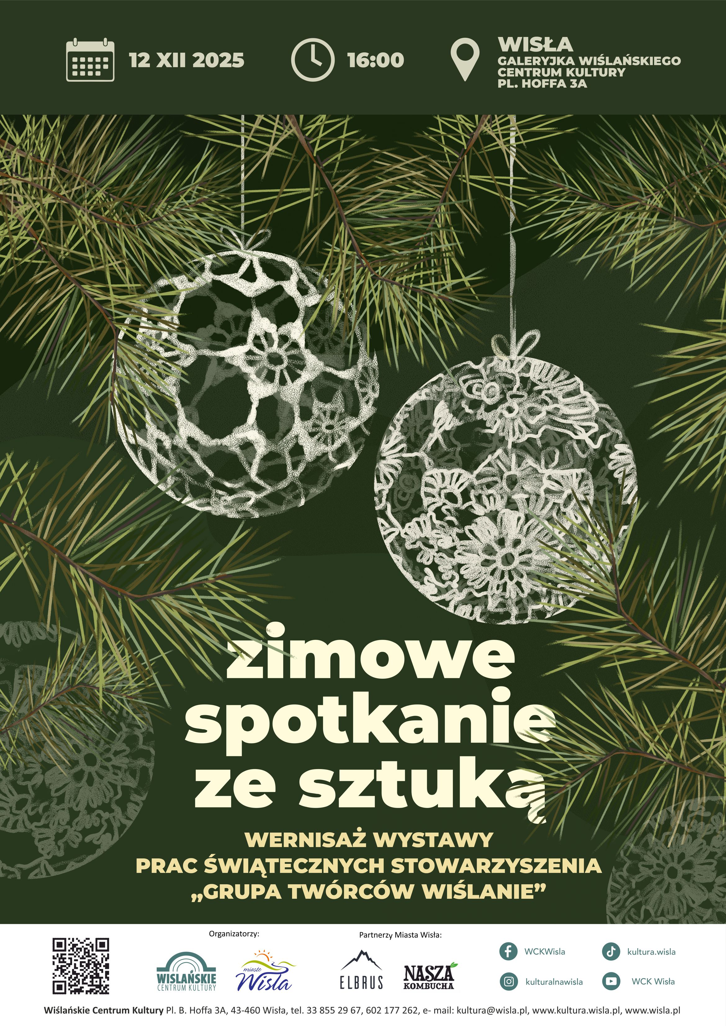 Serdecznie zapraszamy na wyjątkowy wernisaż wystawy prac świątecznych Grupy Twórców Wiślanie pn. „Zimowe spotkanie ze sztuką”, który odbędzie się 12 grudnia w Wiślańskim Centrum Kultury.