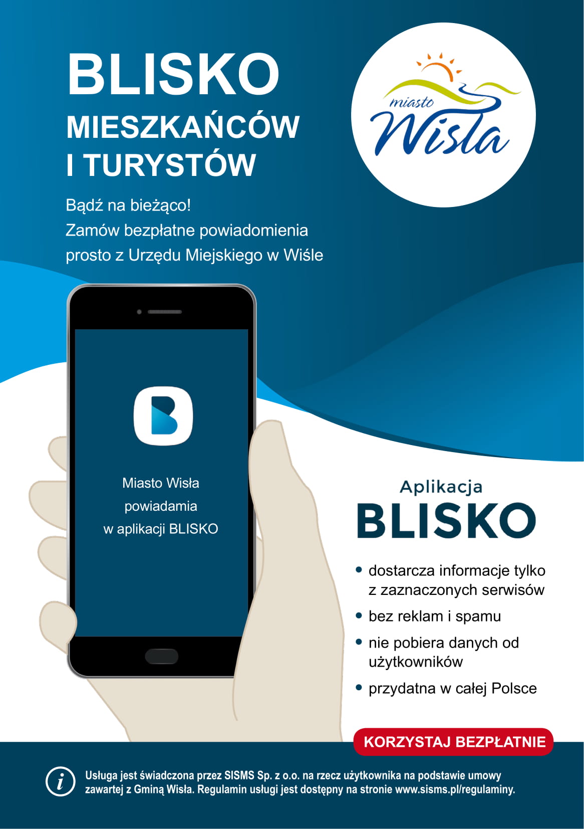 Bądź na bieżąco z informacjami na temat Wisły! Przypominamy, że warto zainstalować aplikację BLISKO, która jest bezpłatnym informatorem zarówno dla mieszkańców jak i dla turystów. Ważne wydarzenia, imprezy, ostrzeżenia meteorologiczne czy utrudnienia w ruchu – dostępne teraz w jednym miejscu! Oprócz informacji z Wisły można śledzić wiadomości z innych serwisów tematycznych np. Child alert, informacje o wyłączeniach prądu, jakości powietrza, itp. Aplikacja zastąpi dotychczasowy system powiadamiania mieszkańców przez SMS.