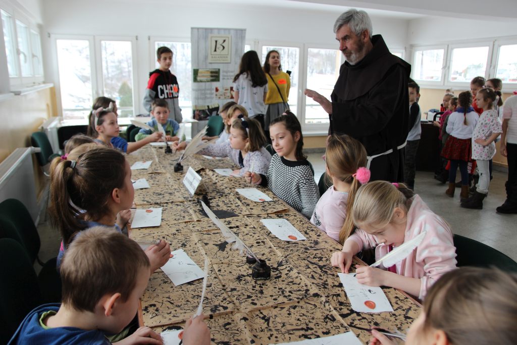 Na początku została przybliżona historia piśmiennictwa, po czym uczestnicy własnoręcznie czerpali papier, odlewali pieczęcie lakowe, barwili kartki techniką japońską, no i oczywiście pisali gęsim piórem. Trenowali też sztukę kaligrafii i integrowali się w czasie zabaw, konkursów i wspólnego tańca. W przerwie uczestnicy posili się rogalikami i herbatą, a na koniec ustawili się do pamiątkowego zdjęcia i z dumą nieśli do domów czerpane arkusze zapisane czarnym atramentem.