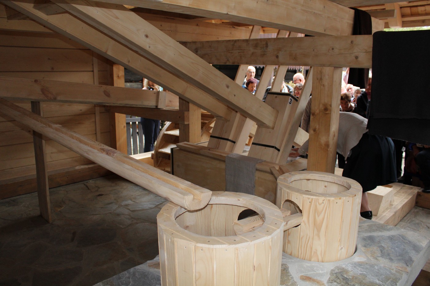 Drewniany wał – osadzony jest na bukowych łożyskach, zaopatrzony w zęby, zakończony drewnianym lub żelaznym czopem. Umożliwia podnoszenie na przemian dwóch ciężkich dębowych stęporów, które opadały na stępę. Jest połączony z kołem wodnym na zewnątrz budynku.