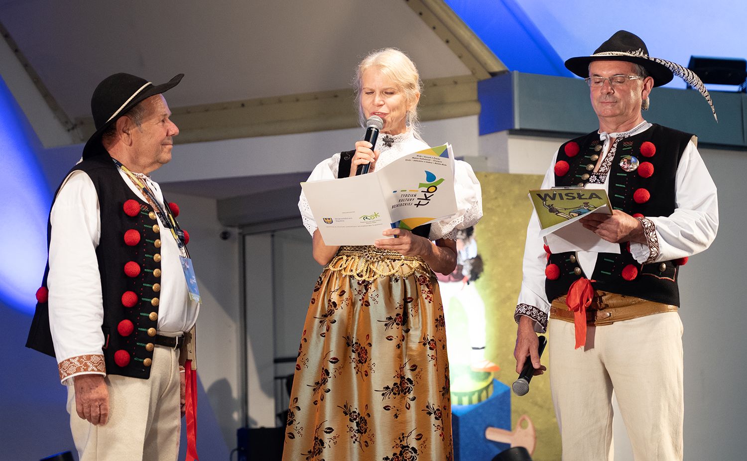 Mimo kropel spadających z nieba, wspólnie przemaszerowaliśmy wiślańskim deptakiem na Amfiteatr im. Stanisława Hadyny, aby uroczyście zainaugurować 62. Tydzień Kultury Beskidzkiej. Klimatyczna inauguracja rozpoczęła się od muzycznej niespodzianki, czyli premiery piosenki „Wisła”, stworzonej specjalnie z myślą o tożsamości wiślańskich górali i duchowej sile muzyki, która od wieków płynie z gór. Muzykę skomponował Michał Szarzec, tekst napisali Kamilla Księżnik i Andrzej Drobik, a w nagraniu usłyszymy głosy Marty Szarzec i Beaty Pilch.