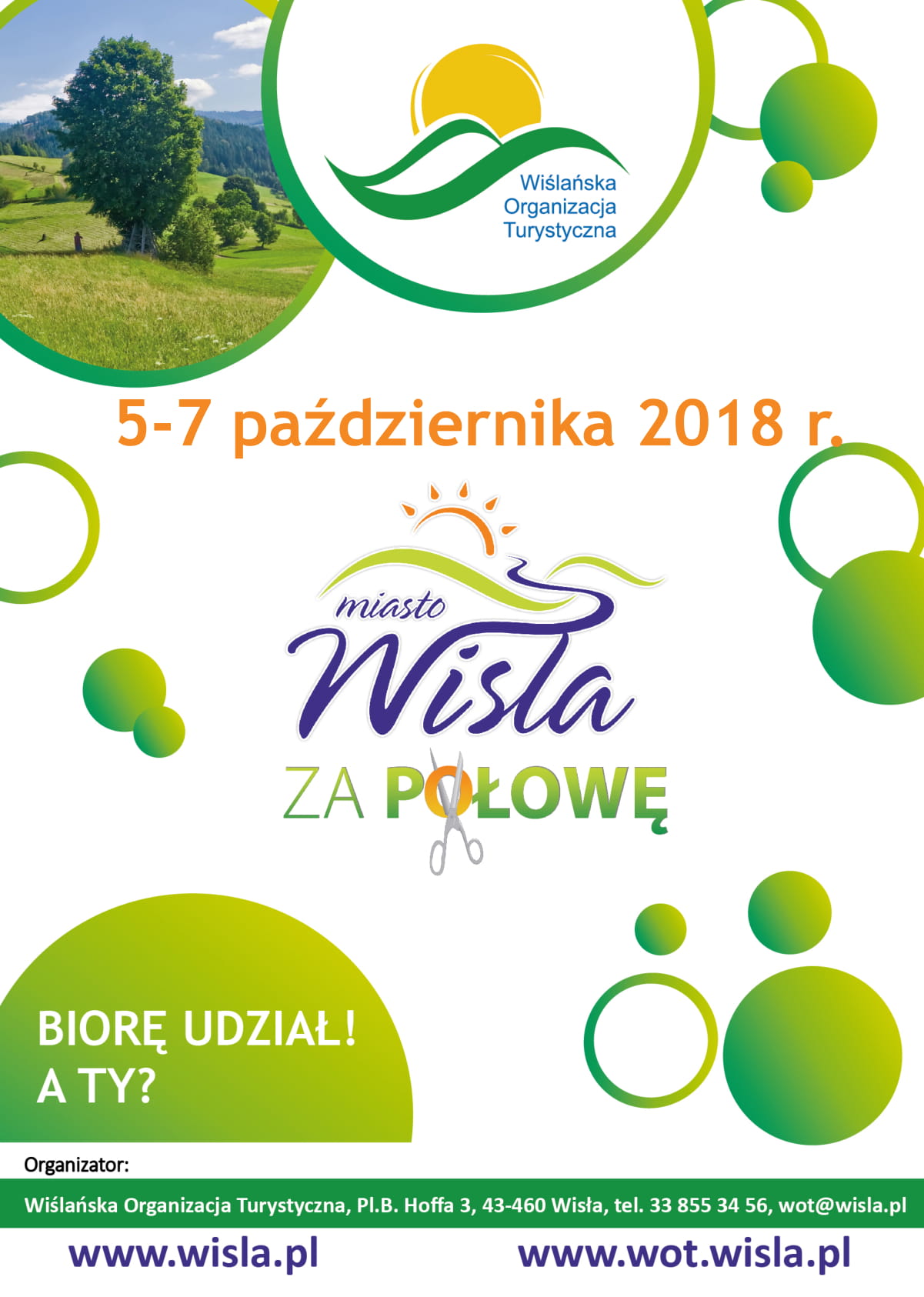 Centralny Punkt Informacyjny akcji „Wisła za Połowę” czynny będzie w dniach 5 i 6.10.2018 r. w godz. 9.00 – 20.00 oraz 7.10.2018 r. w godz. 9.00 – 16.00 w Informacji Turystycznej, Pl. Hoffa 3, tel. 33 855 3456, informacja@wisla.pl
