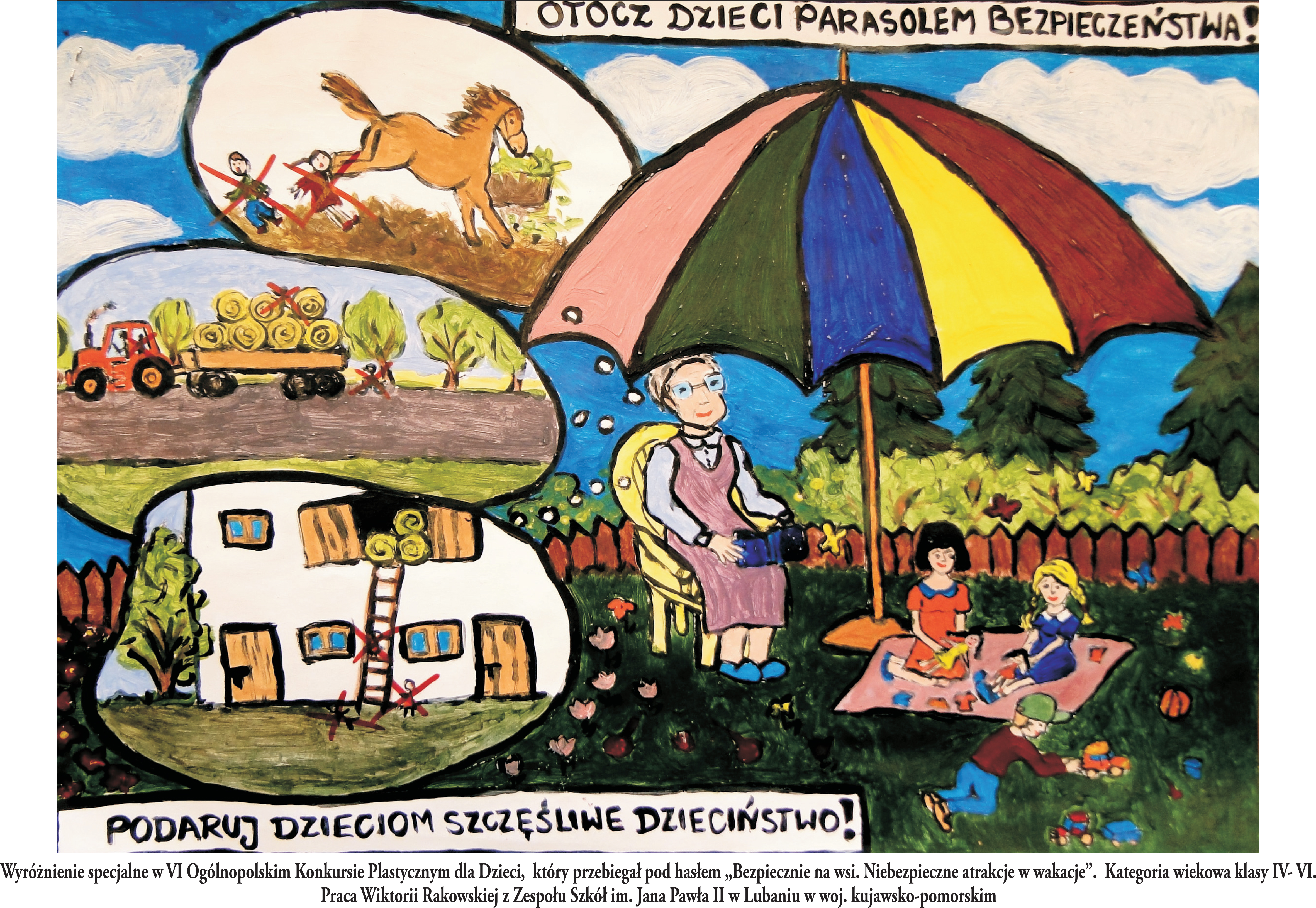 Drodzy Rodzice - Rolnicy, zwracam się do Państwa z apelem o bezpieczne wakacje Waszych podopiecznych. - ,, Otoczcie dzieci parasolem bezpieczeństwa, podarujcie im szczęśliwe dzieciństwo" - apeluję o to słowami uczestniczki naszego VI Ogólnopolskiego Konkursu Plastycznego dla Dzieci, który przebiegał pod hasłem ,, Bezpiecznie na wsi. Niebezpieczne atrakcje w wakacje".