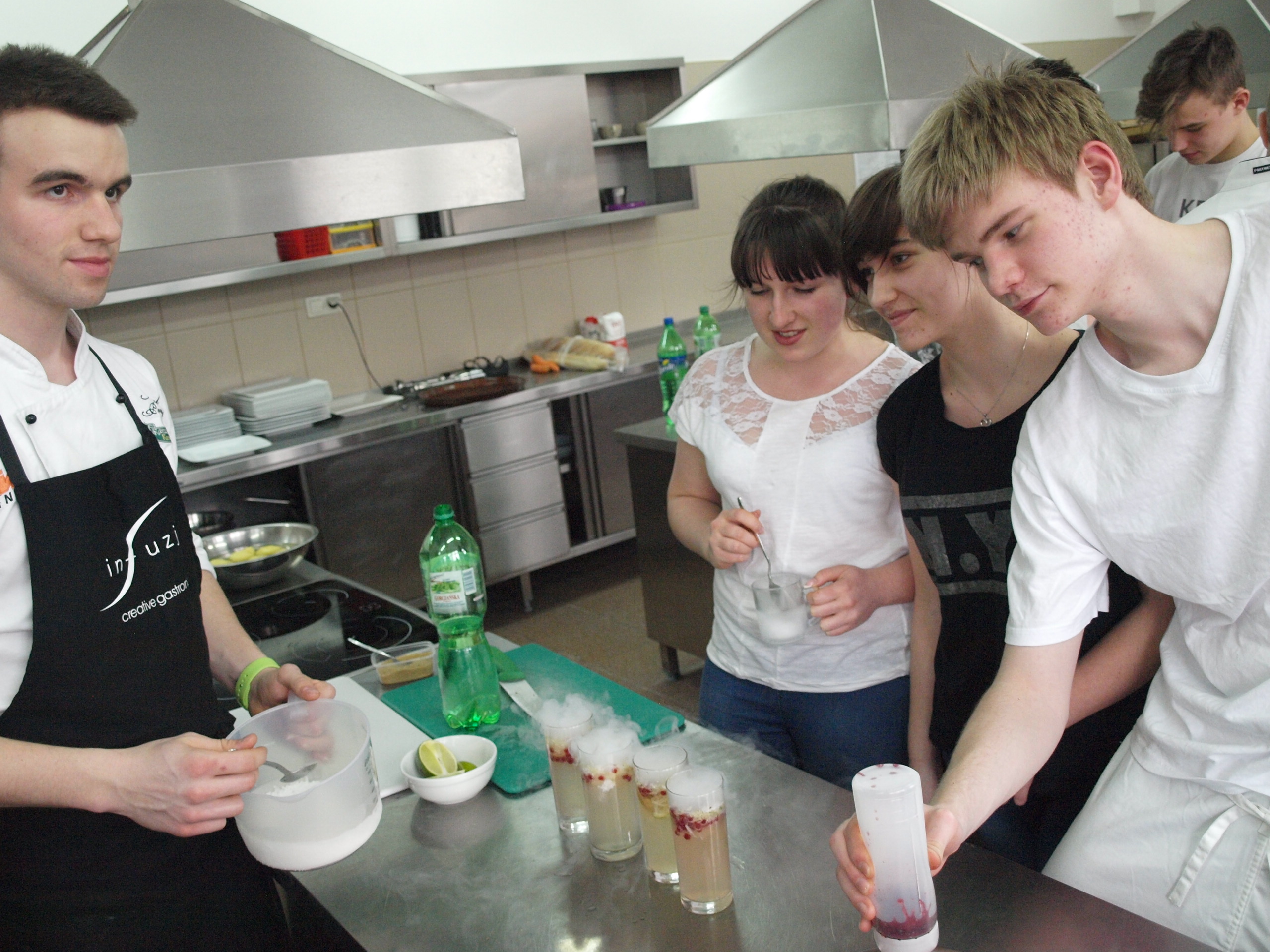 Na co dzień uczniowie nie mają możliwości zapoznania się z tymi metodami, gdyż są drogie w przygotowaniu nie tylko ze względu na specjalistyczny sprzęt, ale i odczynniki niezbędne do wytworzenia produktów wchodzących w skład potrawy. W zajęciach wzięło udział 22 uczniów i uczennic z pionu gastronomicznego i hotelarskiego. Pod czujnym okiem absolwenta ZSGH Łukasza Świtały uczniowie sporządzali napoje bezalkoholowe z dodatkiem elementów kuchni molekularnej, dania na bazie polędwicy wieprzowej i kaczki, przygotowywane metodą sous vide, a także desery i różnego rodzaju przekąski.