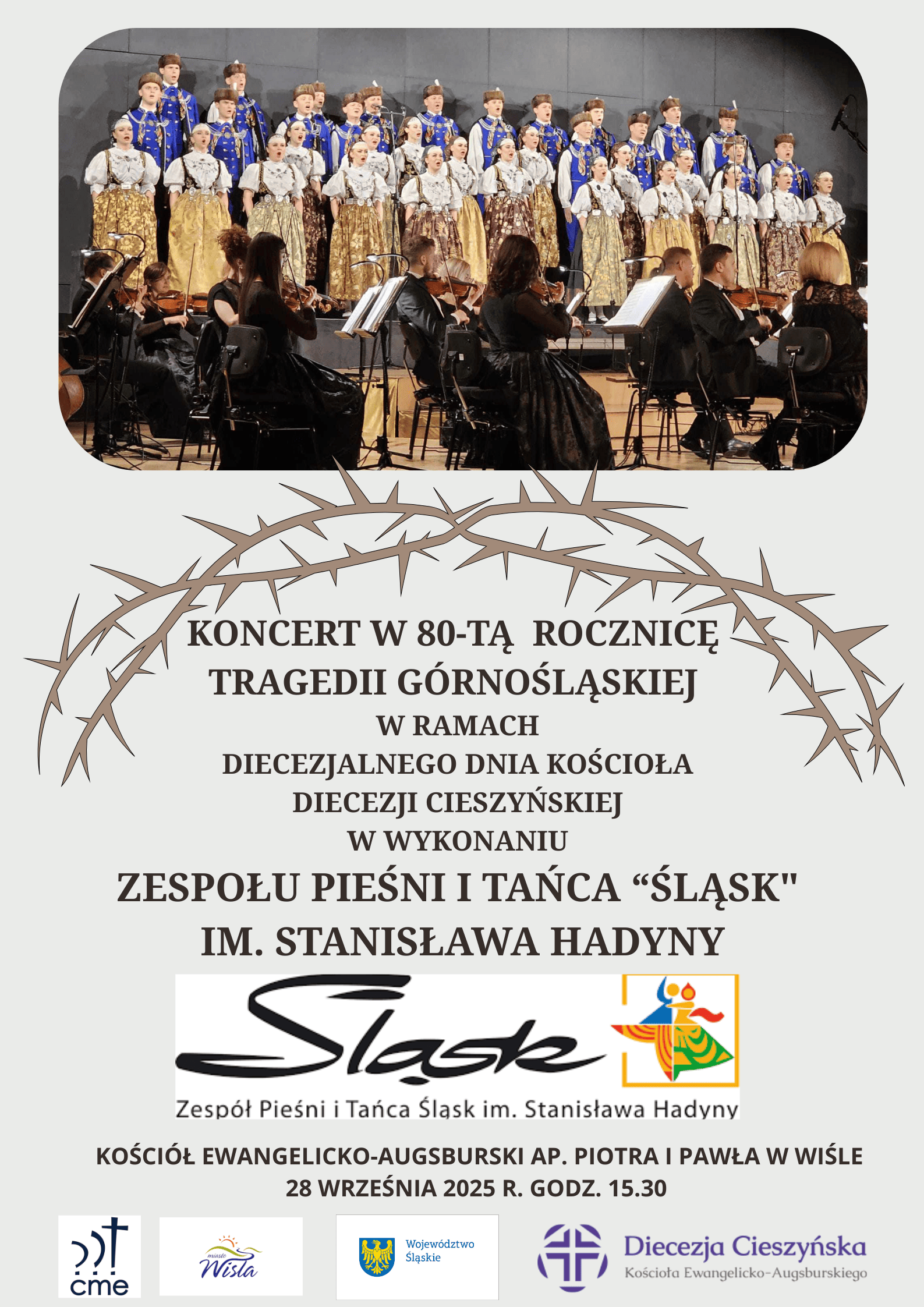 Miasto Wisła oraz Parafia Ewangelicko-Augsburska w Wiśle Centrum zapraszają na niepowtarzalny koncert Zespołu Pieśni i Tańca „Śląsk” im. Stanisława Hadyny. Wydarzenie odbędzie się w niedzielę, 28 września 2025 roku o godz. 15:30 w Kościele Ewangelicko-Augsburskim Apostołów Piotra i Pawła w Wiśle Centrum.
