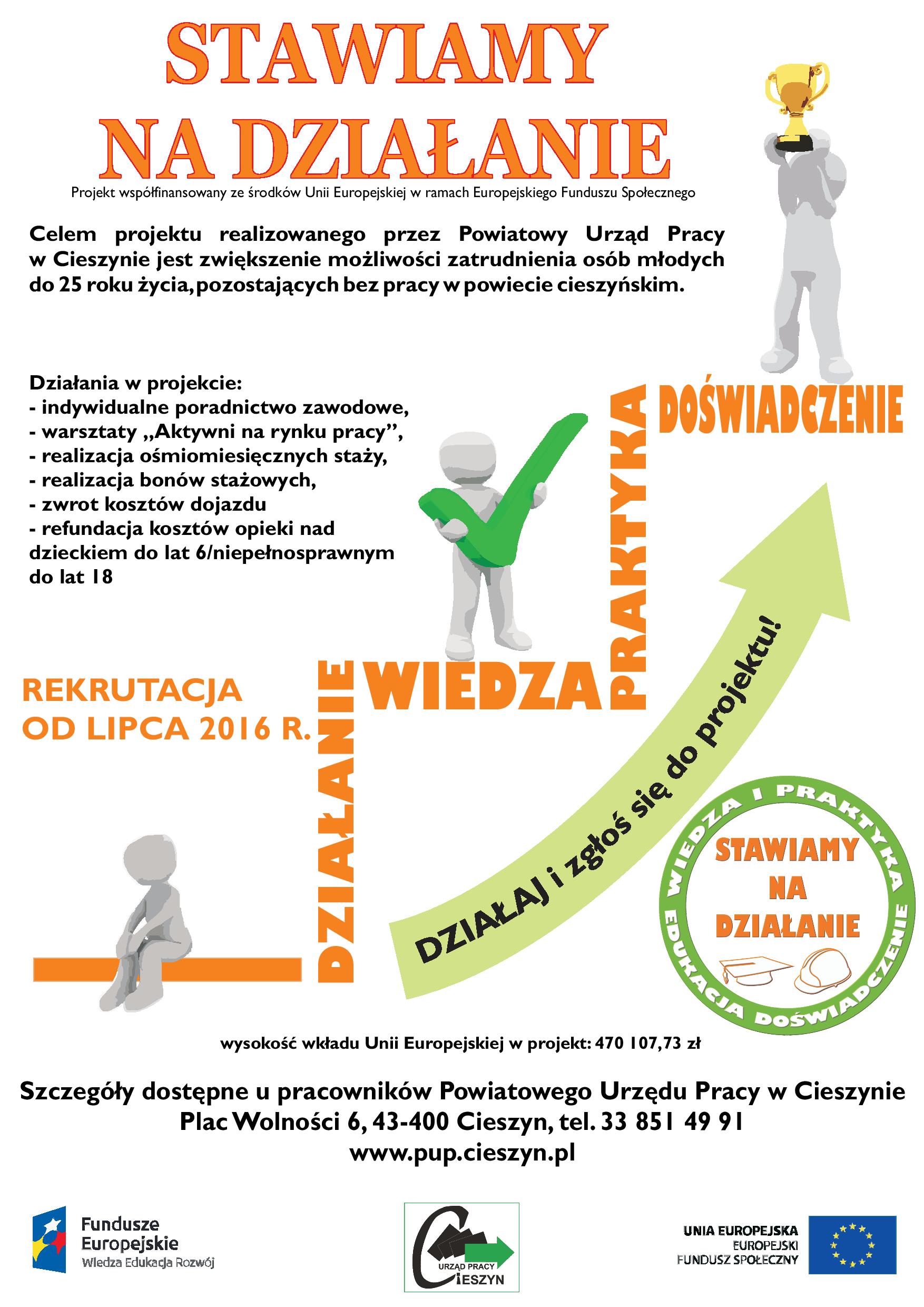 Informujemy, iż od dnia 01.06.2016r. do dnia 31.12.2017 r. Powiatowy Urząd Pracy w Cieszynie realizuje projekt konkursowy pn. "Stawiamy na działanie", który jest współfinansowany ze środków Europejskiego Funduszu Społecznego w ramach Poddziałania 1.2.1 Programu Operacyjnego Wiedza Edukacja Rozwój (Priorytet I – Osoby