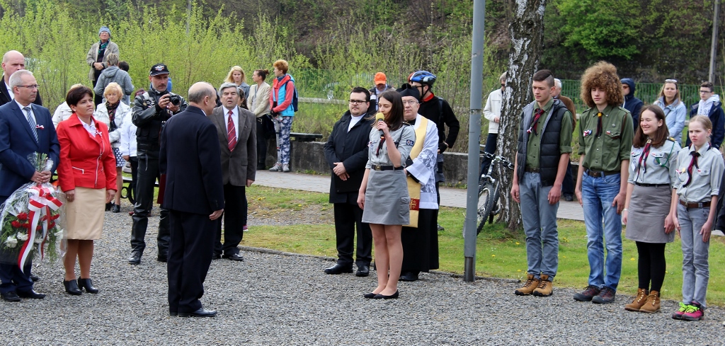 Zanim rozpoczęła się część oficjalna, gromadzący się pod pomnikiem uczestnicy obchodów mogli wysłuchać koncertu orkiestry dętej pod kierunkiem Henryka Itnera, która zadbała o oprawę muzyczną wydarzenia. Punktualnie o 12:00 zabrzmiał hymn państwowy, a następnie sekretarz miasta Jan Cieślar odebrał meldunek od wiślańskich harcerzy i odczytał list burmistrza Wisły Tomasza Bujoka, który w tym czasie, na zaproszenie prezydenta Andrzeja Dudy, uczestniczył w państwowych obchodach Święta Konstytucji 3 Maja w Warszawie.