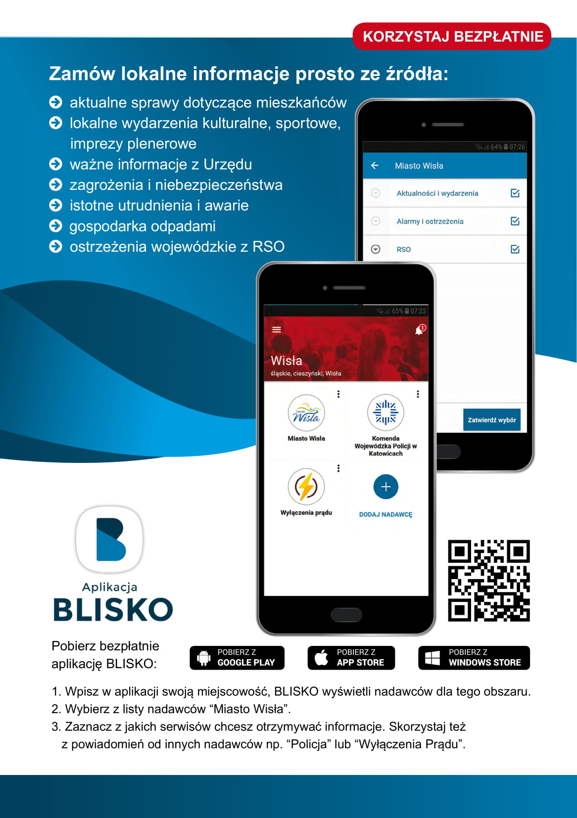 Bądź na bieżąco z informacjami na temat Wisły! Przypominamy, że warto zainstalować aplikację BLISKO, która jest bezpłatnym informatorem zarówno dla mieszkańców jak i dla turystów. Ważne wydarzenia, imprezy, ostrzeżenia meteorologiczne czy utrudnienia w ruchu – dostępne teraz w jednym miejscu! Oprócz informacji z Wisły można śledzić wiadomości z innych serwisów tematycznych np. Child alert, informacje o wyłączeniach prądu, jakości powietrza, itp. Aplikacja zastąpi dotychczasowy system powiadamiania mieszkańców przez SMS.