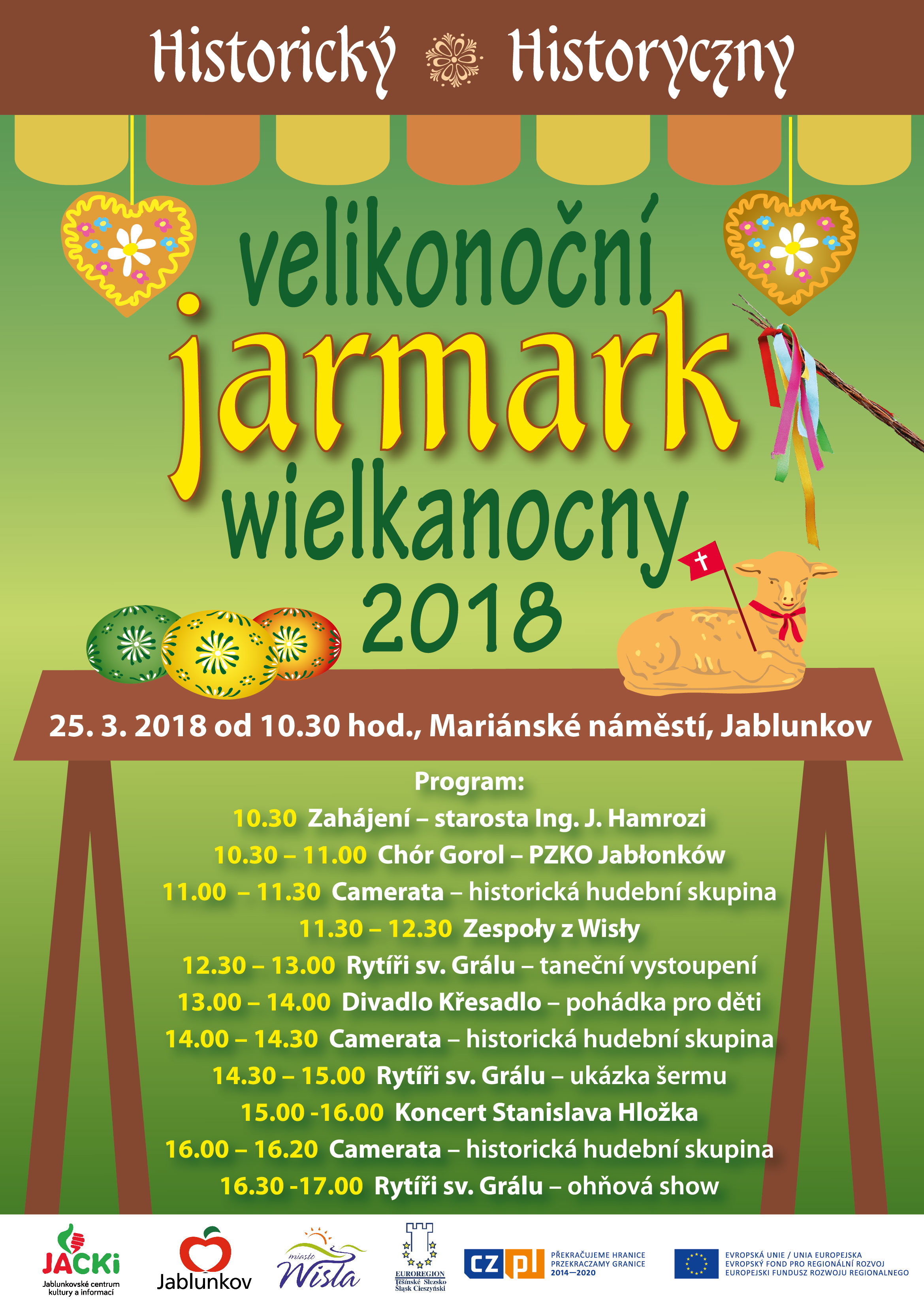 Serdecznie zapraszamy na Jarmark Wielkanocny w Jabłonkowie w dniu 25 marca 2018r., który jest kontynuacją projektu " Wisła - Jabłonków - jesteśmy blisko siebie" dofinansowany jest ze środków Unii Europejskiej w ramach Europejskiego Funduszu Rozwoju Regionalnego Programu Interreg V-A Republika Czeska – Polska 2014-2020.
