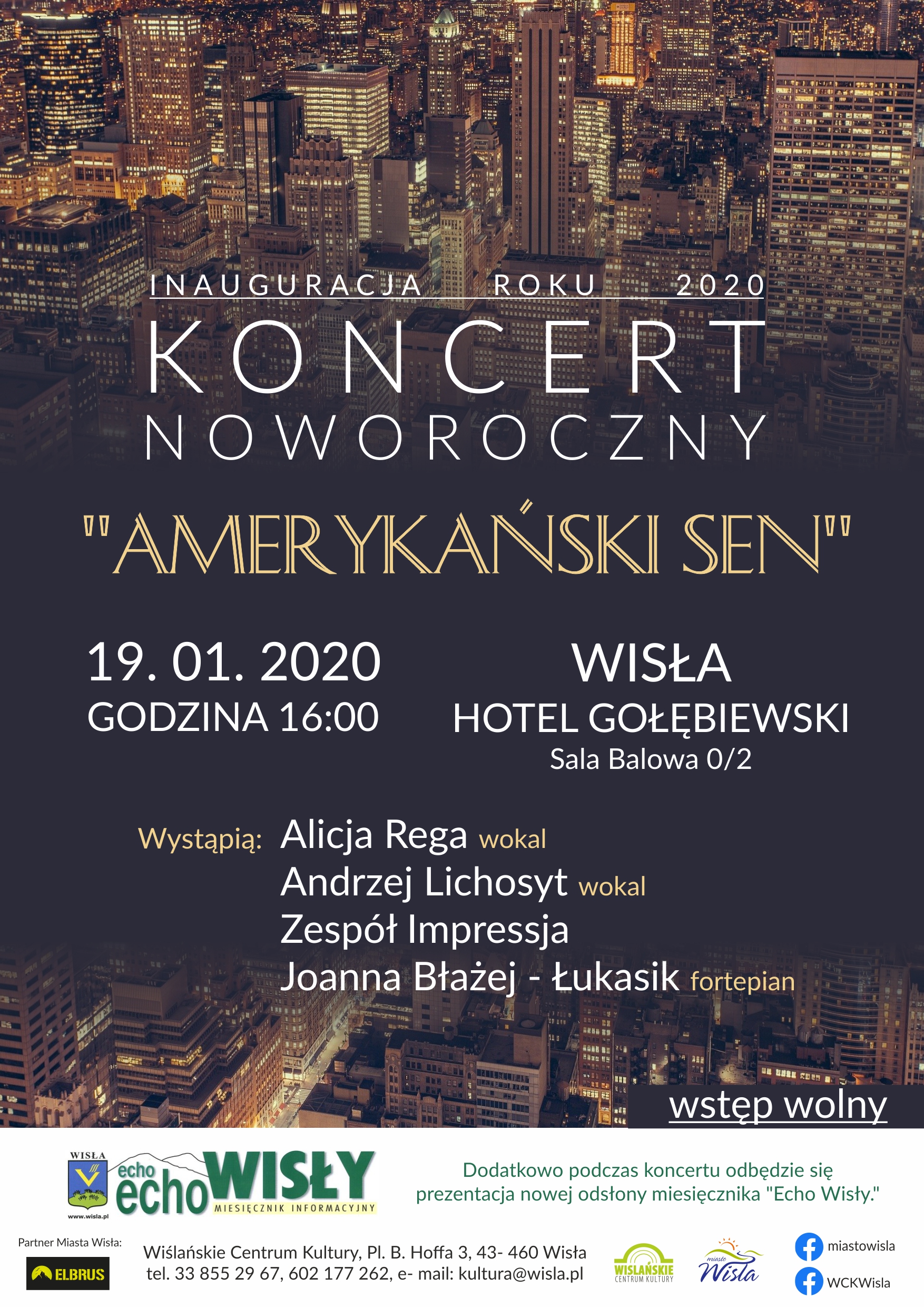 Tradycyjnie już w styczniu Burmistrz Miasta Wisła zaprasza na Koncert Noworoczny, który tym razem odbędzie się w stylu amerykańskim. Podczas koncertu zaprezentowane zostaną najlepsze przeboje zza Oceanu, które wprowadzą w klimat Broadway’u, najbardziej prestiżowych estrad, popularnych filmów i kultowych musicali Ameryki. Koncert pt. "Amerykański Sen" to urokliwy program, który przedstawi zespół Impressa oraz Alicja Rega (wokal), Andrzej Lichosyt (wokal), oraz Joanna Błażej-Łukasik (piano). Dodatkowo przed koncertem odbędzie sie specjalny występ świetnego saksofonisty Jacka Kołtuniaka.