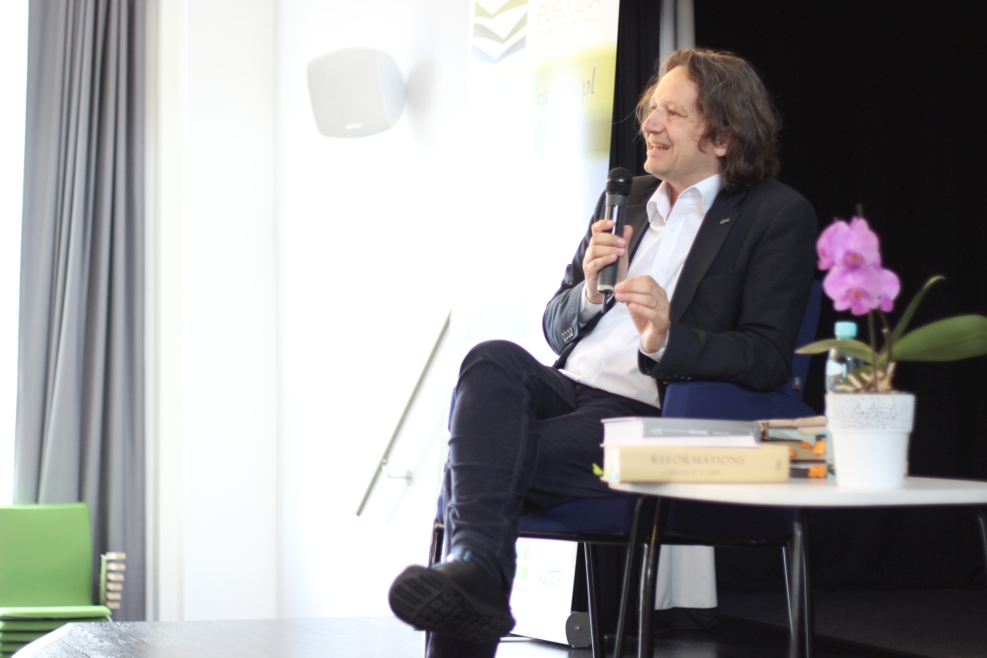 Punktem wyjścia wykładu było jedno zdanie z „Lalki” Bolesława Prusa zapisane w pamiętniku subiekta doskonałego, Ignacego Rzeckiego. Mianowicie notuje on informację o pracowniku sklepu Wokulskiego Mraczewskim, że siedział w teatrze z Matyldą w ósmym rzędzie na operze „Hugonoci” Giacomo Meyerbeera. Zdanie wydawałoby się zbędne w arcydziele jakim jest „Lalka”, jednak w jakimś celu zamieszczone przez Bolesława Prusa. Po co? Nie wiemy, ale możemy dociekać skąd się wzięli francuscy protestanci w XIX-wiecznej, polskiej powieści realistycznej. Dalej była mowa o niepoznawalności Lutra, od którego zaczęła się nie reformacja, ale nasze myślenie o niej, przykrawaniu postaci reformatora do swoich idei przez poszczególne epoki, rewolucji w postrzeganiu człowieka, jaka miała miejsce w XVI wieku, m.in. dzięki Lutrowi, ale i całej plejadzie uczonych. Profesor czytał i wykładał poezje Reja, Kochanowskiego i Sępa-Szarzyńskiego, a na zakończenie była wisienka na torcie czyli rzecz o luteranizmie w prozie Jerzego Pilcha. O jego ironii i nostalgii za utraconym dziedzictwem i o porządkowaniu chaosu rzeczywistości przez precyzję słowa.