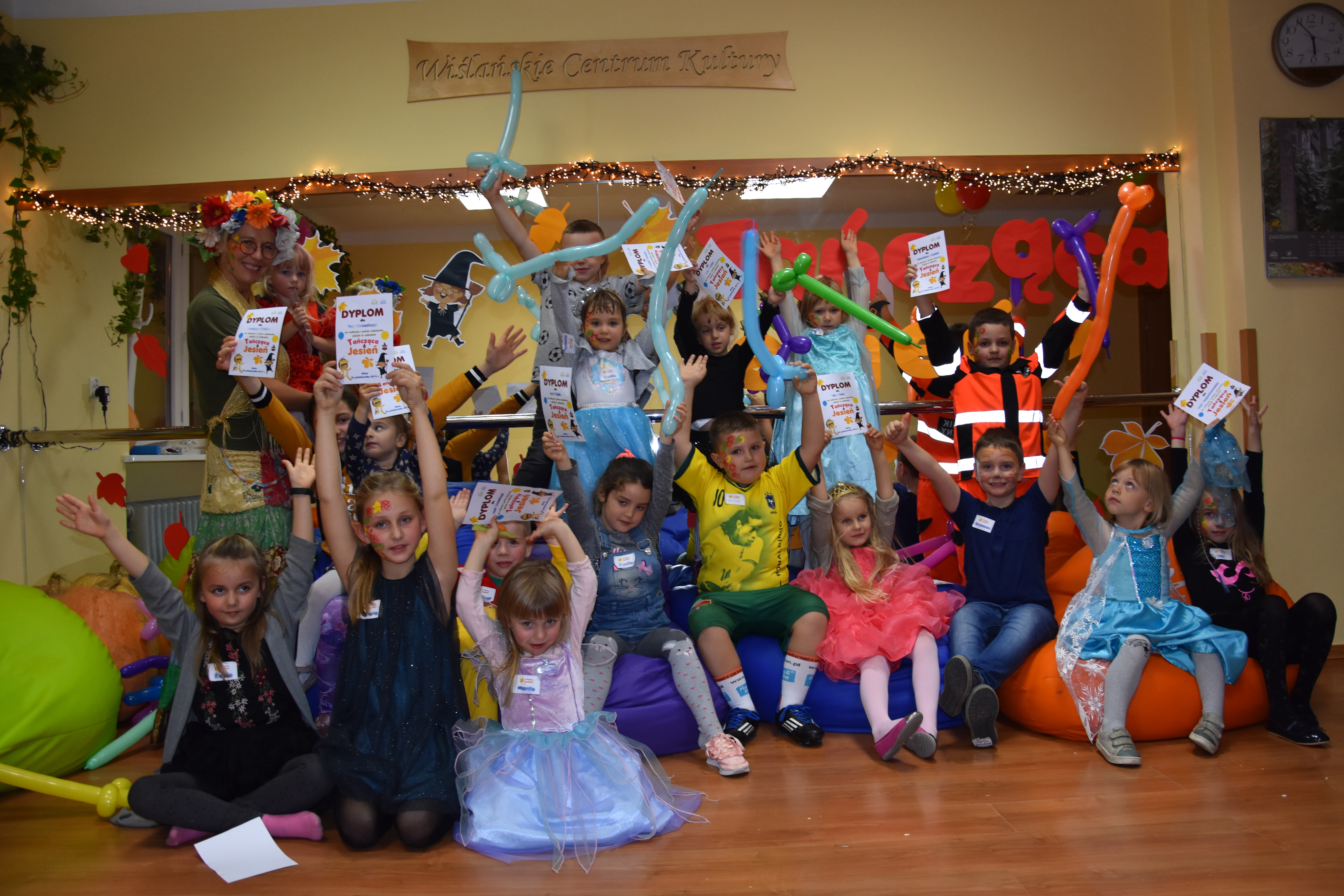 W sobotę 26 października odbyła się zabawa dla dzieci pt. „Tańcząca Jesień”. W rolę Pani Jesieni, która poprowadziła zabawę, wcieliła się Karolina Fojcik – Pustelnik. Dzieci, które przybyły na zabawę były przebrane w stroje księżniczek, biedronki, misia czy ratownika. Wszyscy bawili się wspólnie przy wesołych piosenkach. Każde z dzieci mogło zaprezentować swój talent i mieć pomalowaną twarz lub rączkę w piękne jesienne wzory. Na koniec zabawy każdy z uczestników balu otrzymał pamiątkowy dyplom. Dodatkowymi atrakcjami były balonowe zwierzątka oraz drobny poczęstunek. Rodzice oczekujący na dzieci mogli miło spędzić czas przy kawie oraz antystresowych kolorowankach. Organizatorem „Tańczącej Jesieni” było Wiślańskie Centrum Kultury. Dziękujemy za wspólną zabawę!