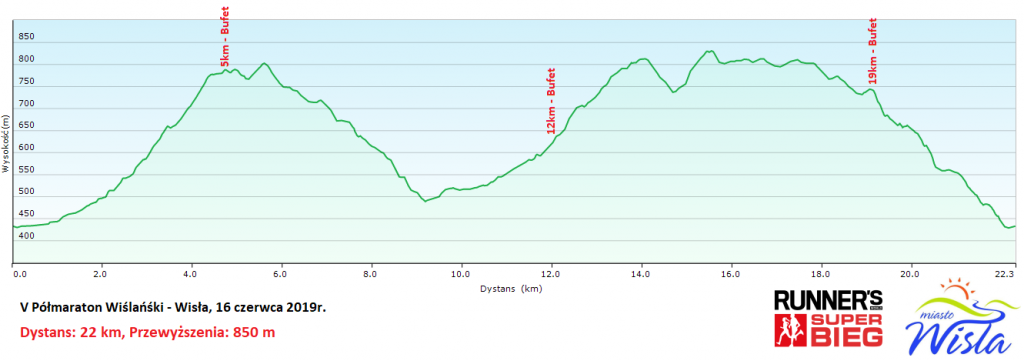 Półmaraton (22 km) dość szybko ucieka z centrum Wisły w górę, w kierunku Trzech Kopców. Długi selektywny podbieg jest tym co górscy biegacze lubą najbardziej, zwłaszcza zaraz po starcie ;-). Potem w dół, w kierunku Brennej i znów w górę, łagodnie, doliną Leśnicy. Aż trzeba będzie wbiec z powrotem na beskidzki grzbiet. Znów przez Trzy Kopce, na Cyrhlę i w dół do mety. Malowniczo, widokowo, wymagająco i długo – jak na prawdziwy górski półmaraton przystało.