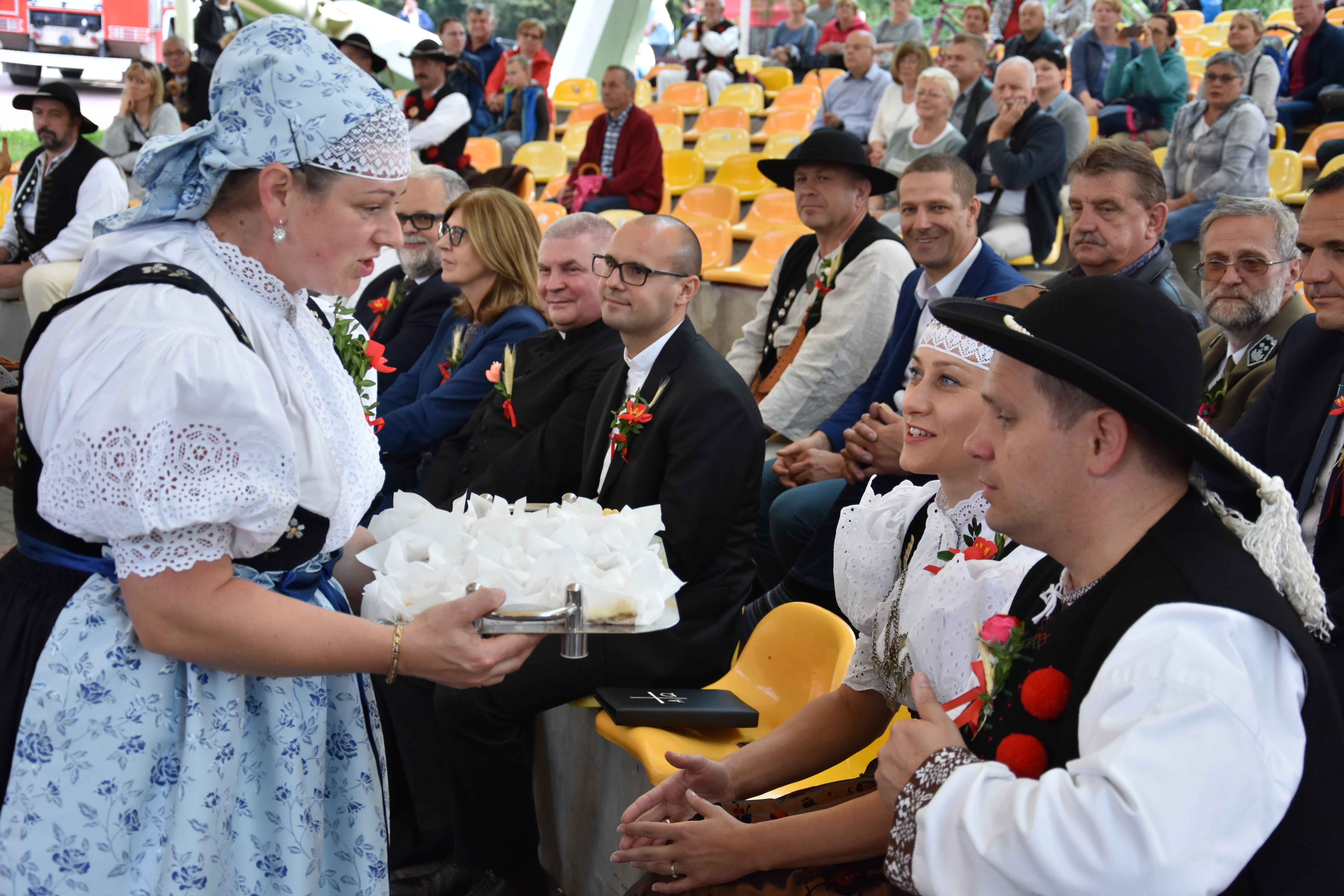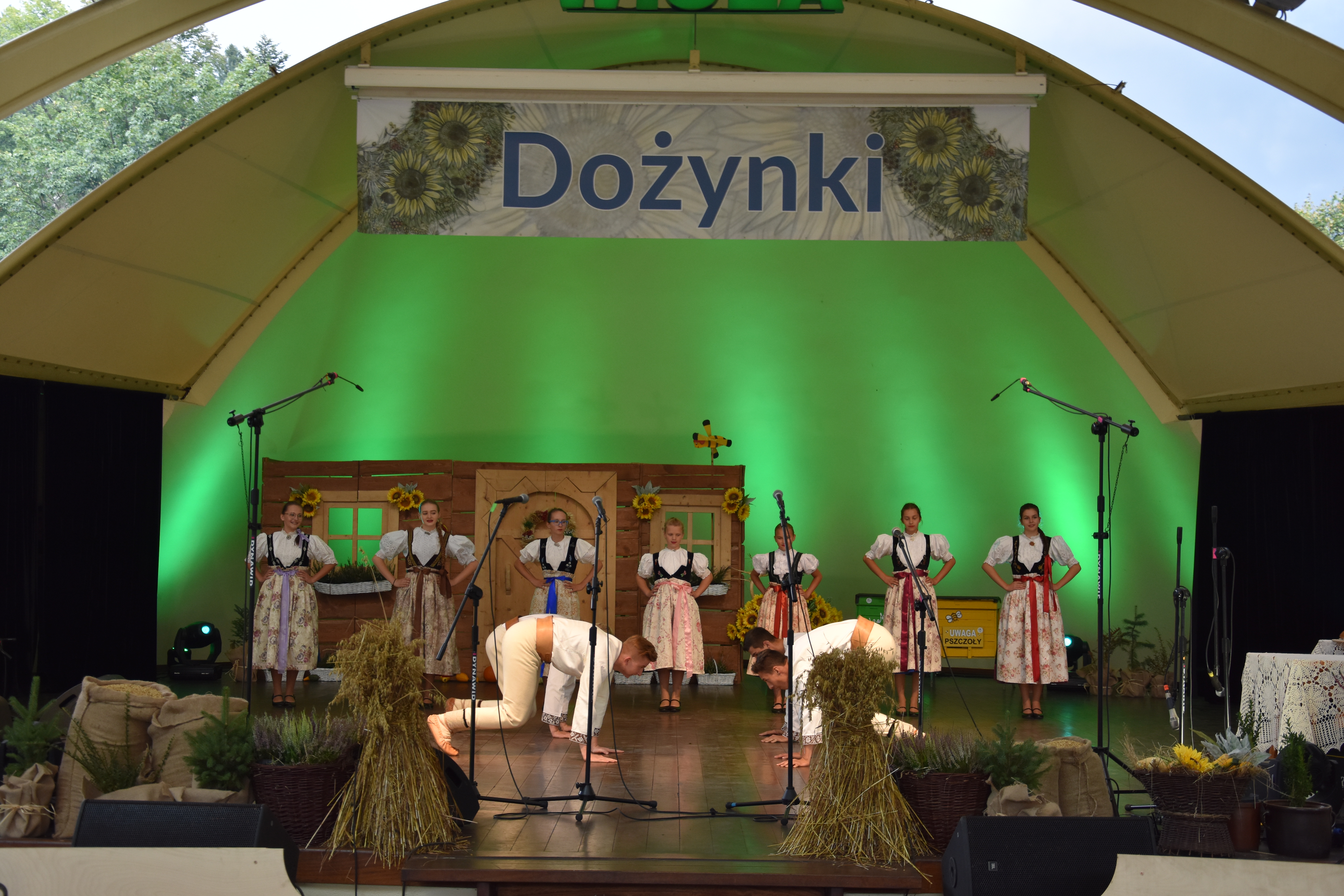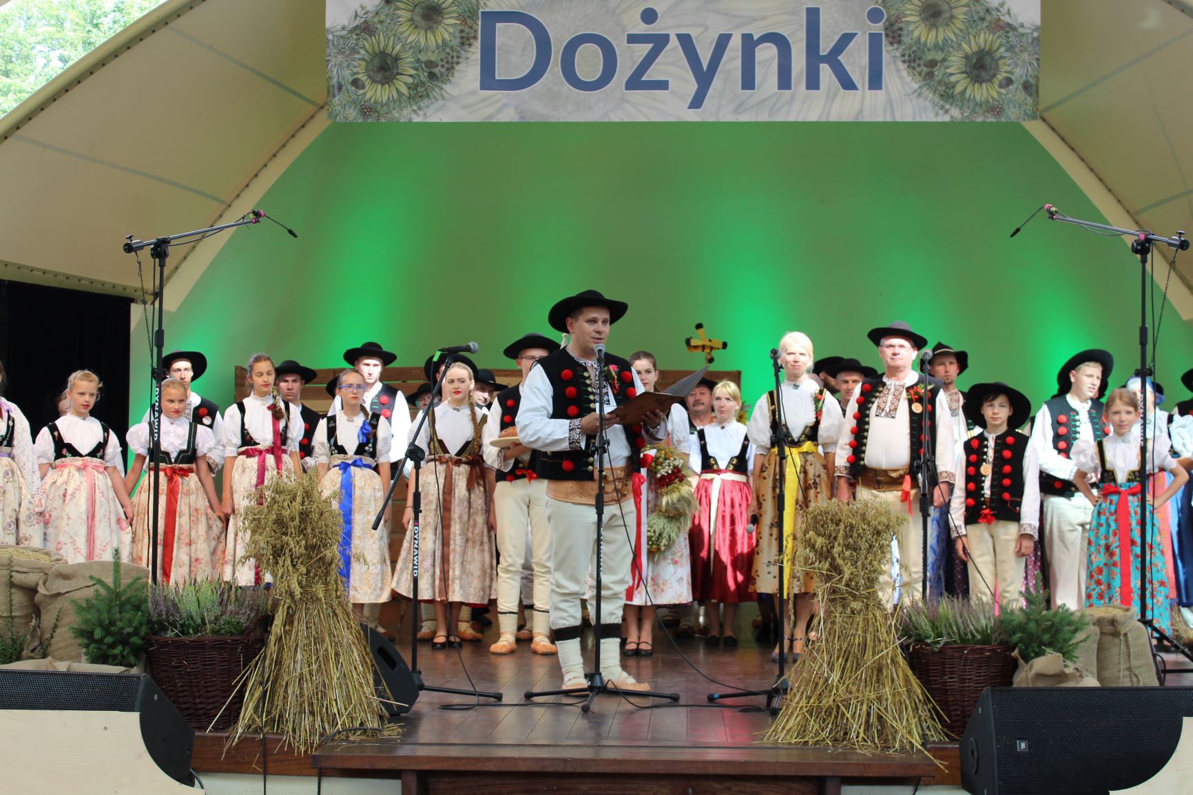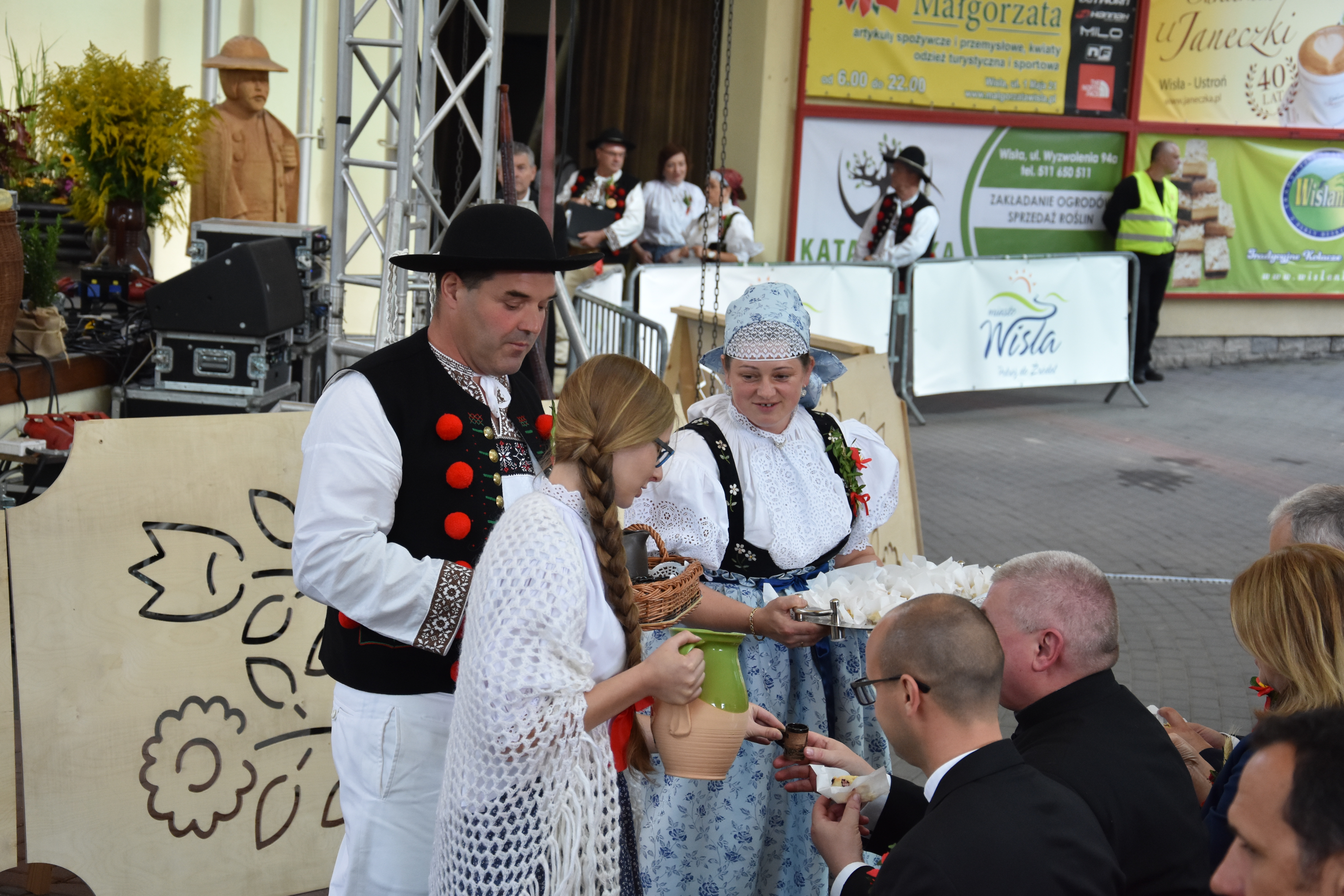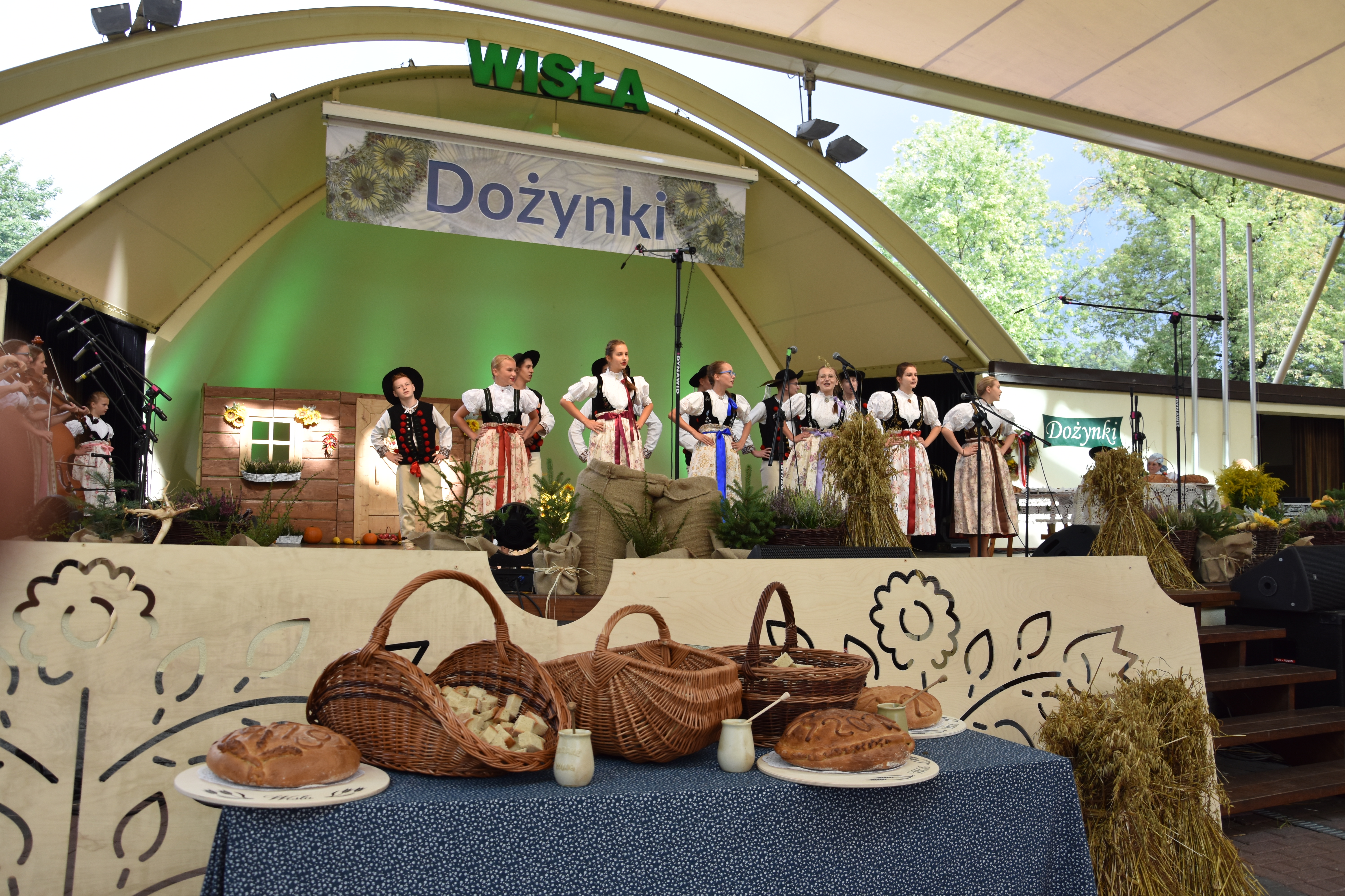 Po zakończeniu korowodu, na scenie amfiteatru imienia Stanisława Hadyny w Wiśle rozpoczęto obrzęd dożynkowy, który był jednym z głównych punktów programu wislańskich dożynek. Tomasz Bujok, burmistrz miasta Wisła przywitał zgromadzonych gości oraz tegorocznych gazdów. Po ekumenicznej modlitwie, którą zmówili ks. proboszcz Wiesław Firlej oraz ks. Oskar Wild. Piękny obrzęd dożynkowy przedstawił z kolei zespół regionalny "Wisła". Publiczność mogła skosztować chleba z miodem i wiślańskich kołoczy, które rozdawawali Tomasz Bujok z żoną Anną, gazdowie dożynek - Małgorzata i Andrzej Pilch oraz pracownicy Wiślańskiego Centrum Kultury.