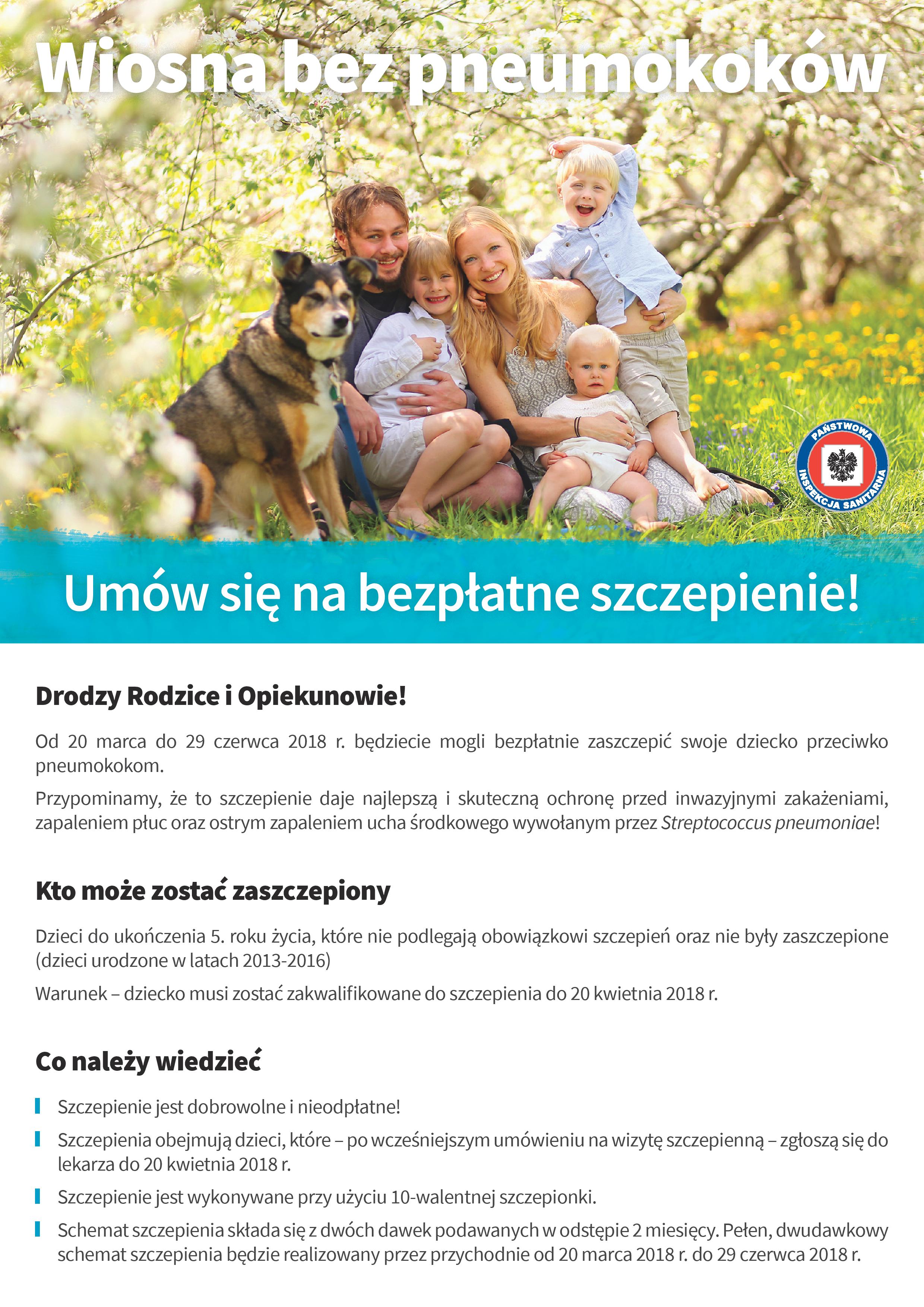Drodzy Rodzice i Opiekunowie! Od 20 marca do 29 czerwca 2018 r. będziecie mogli bezpłatnie zaszczepić swoje dziecko przeciwko pneumokokom.