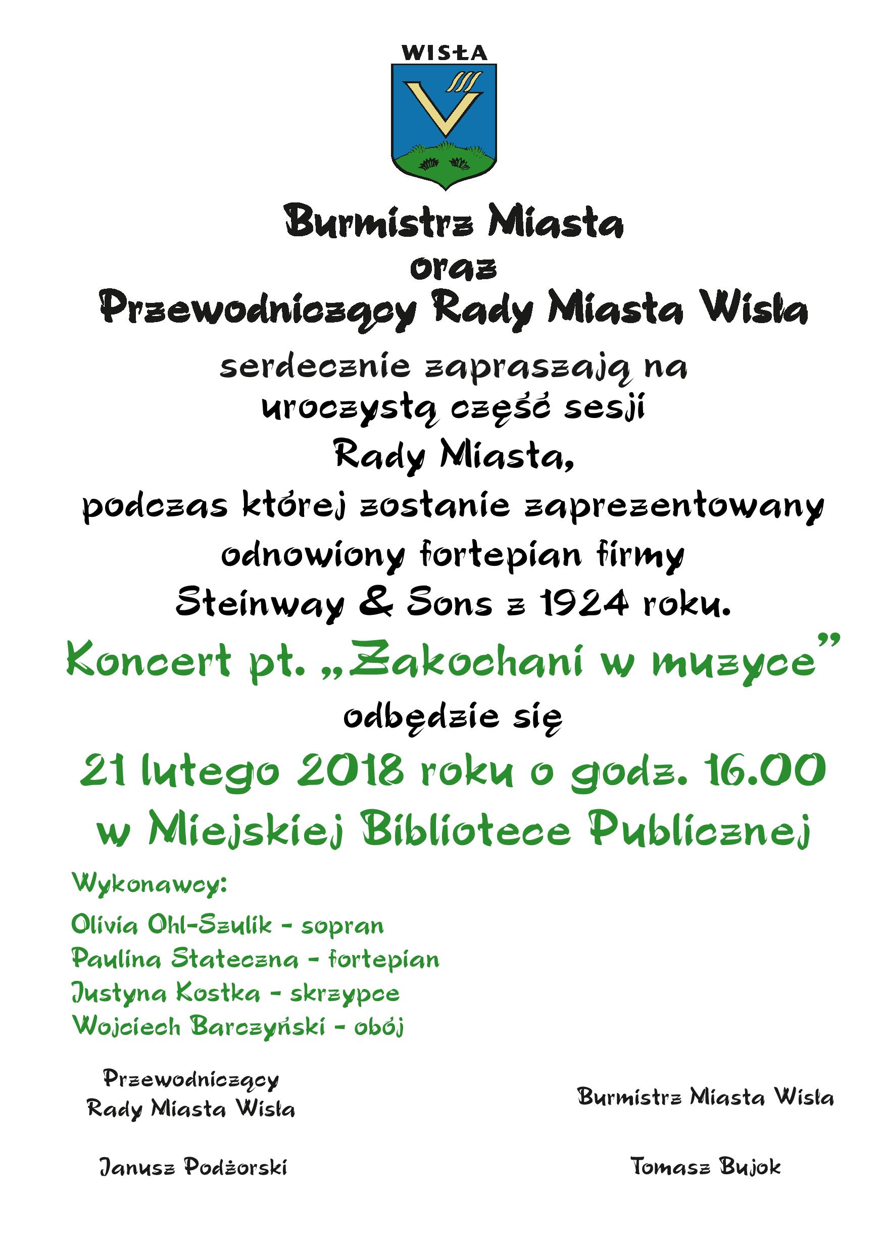 Burmistrz Miasta oraz Przewodniczący Rady Miasta Wisła zapraszają na uroczystą część sesji Rady Miasta, podczas której zostanie zaprezentowany odnowiony fortepian firmy