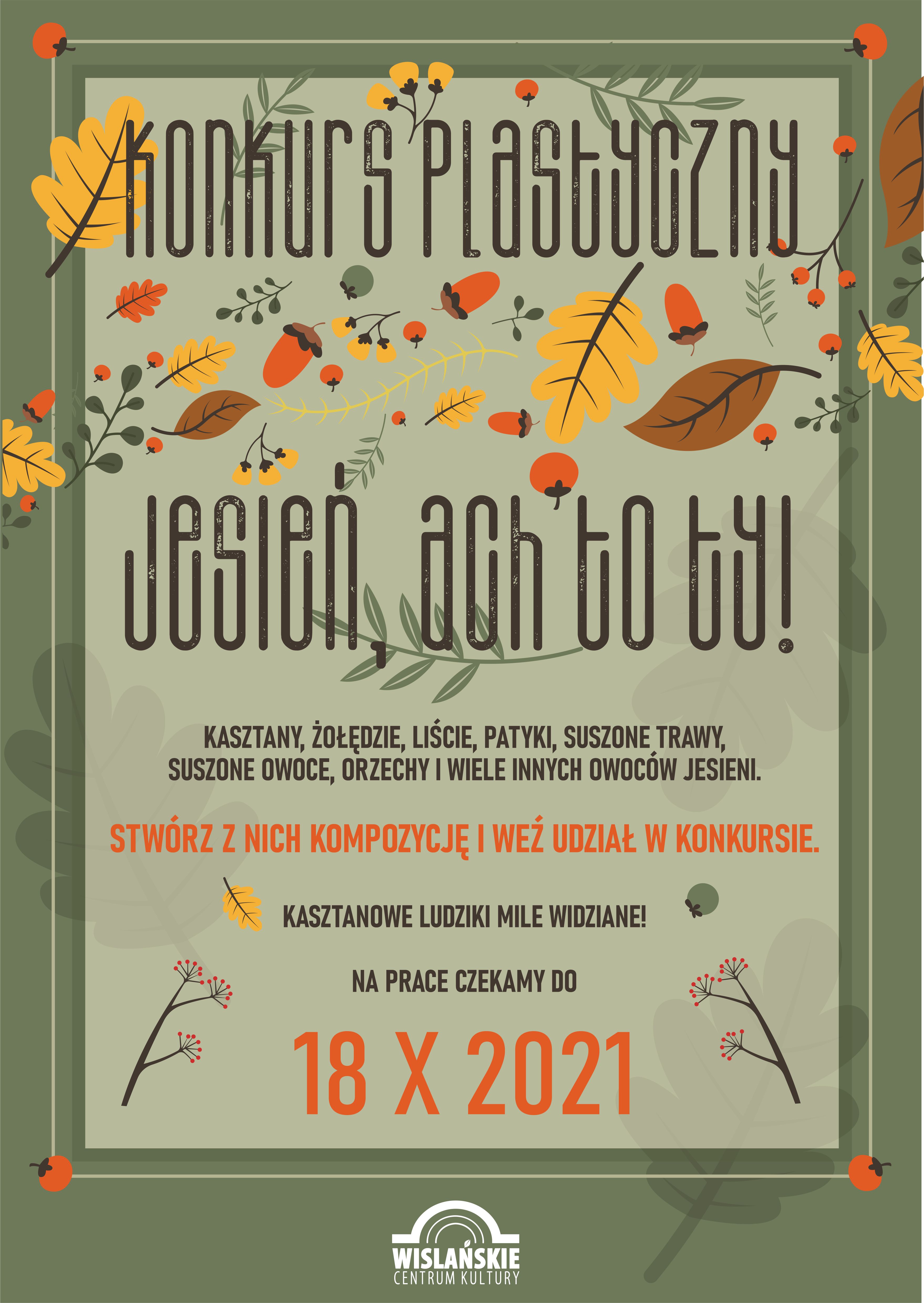 Prace należy dostarczyć do siedziby Wiślańskiego Centrum Kultury, do dnia 18.10.2021 roku. Do pracy muszą być załączone: metryczka i oświadczenie, które są załącznikiem do Regulaminu konkursu "Jesień, ach to ty!".