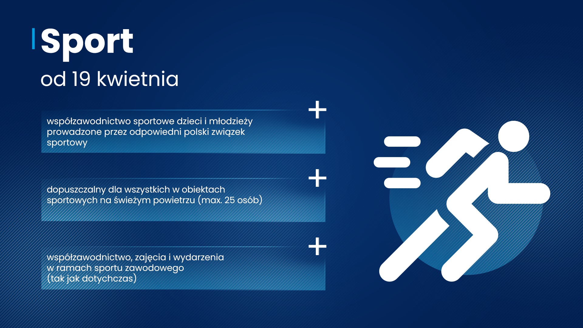 Sport – od 19 kwietnia możliwe będzie uczestnictwo dzieci i młodzieży we współzawodnictwie sportowym prowadzonym przez odpowiedni polski związek sportowy. Możliwe będzie również uprawianie sportu w obiektach sportowych na świeżym powietrzu – przy zachowaniu limitu do 25 osób (zarówno dzieci i młodzieży, jak i dorosłych). Natomiast działalność pozostałych obiektów sportowych (hale, kryte boiska itd.) nadal jest ograniczona wyłącznie do sportu zawodowego (tak jak dotychczas). Wszelkie wydarzenia mogą się odbywać bez udziału publiczności. Zamknięte pozostają m.in. siłownie, kluby fitness, baseny, sauny i solaria. Wyjątki od zasad określa rozporządzenie.