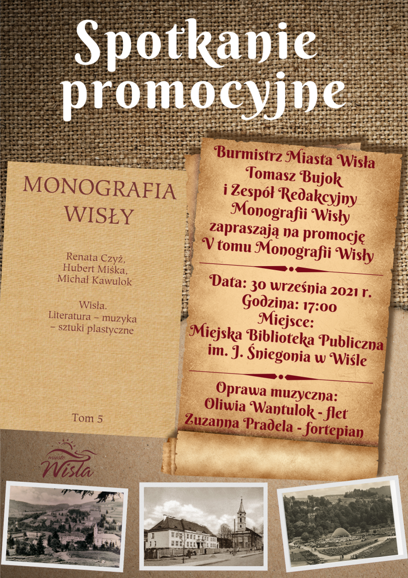 Burmistrz Miasta Wisła Tomasz Bujok i Zespół Redakcyjny Monografii Wisły zapraszają na promocję V tomu Monografii Wisły zatytułowanego „Wisła. Literatura – muzyka – sztuki plastyczne" autorstwa Renaty Czyż, Huberta Miśki i Michała Kawuloka. Spotkanie odbędzie się w dniu 30 września o godz. 17:00 w sali widowiskowej Miejskiej Biblioteki Publicznej im. J. Śniegonia w Wiśle.