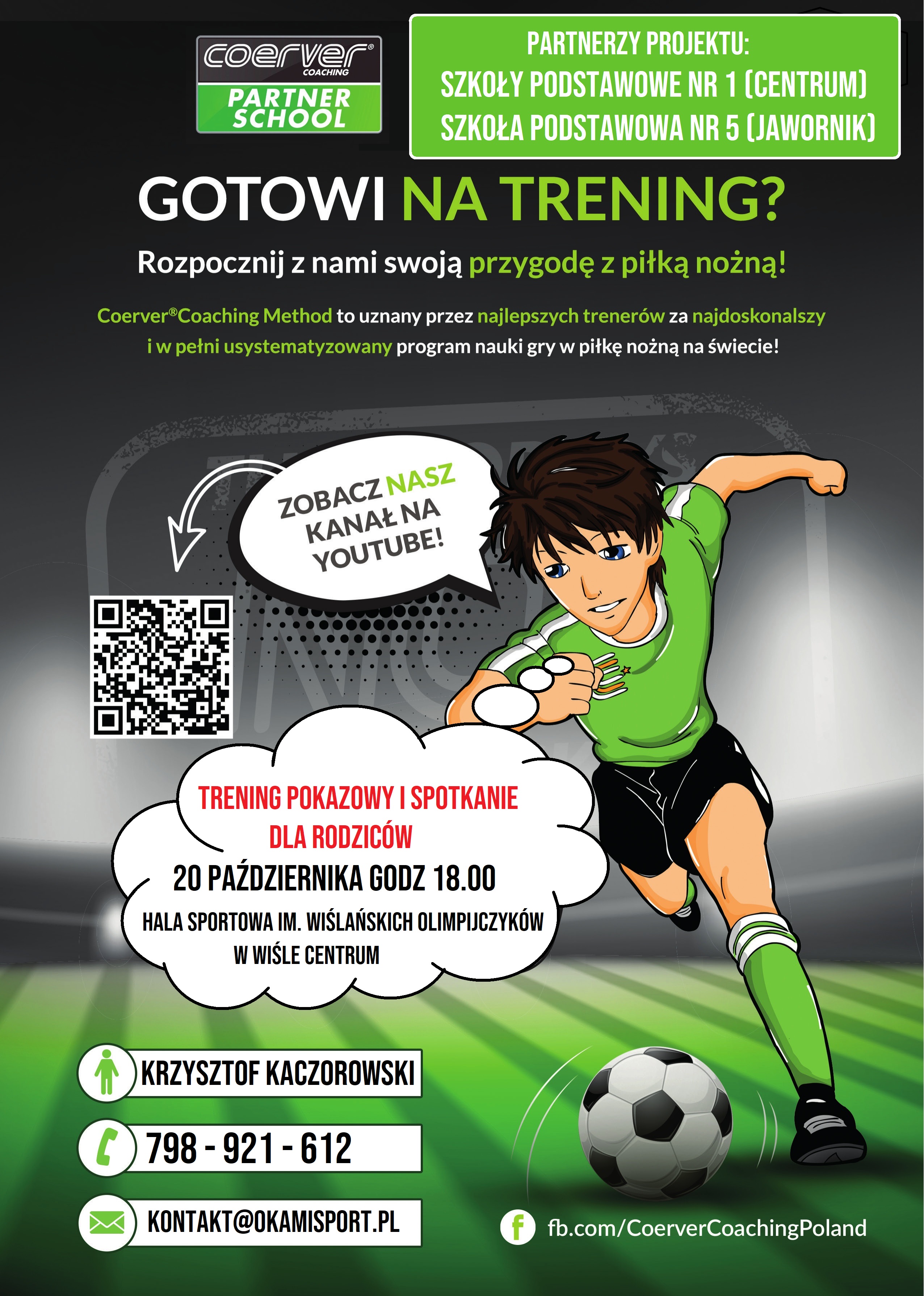 Zajęcia prowadzić będzie trener Krzysztof Kaczorowski (licencja UEFA B oraz Coerver Coach Assistant). Zapraszamy serdecznie na trening pokazowy oraz spotkanie dla rodziców, który odbędzie się 20 października o godz. 18.00 w Hali Sportowej im. Wiślańskich Olimpijczyków.
