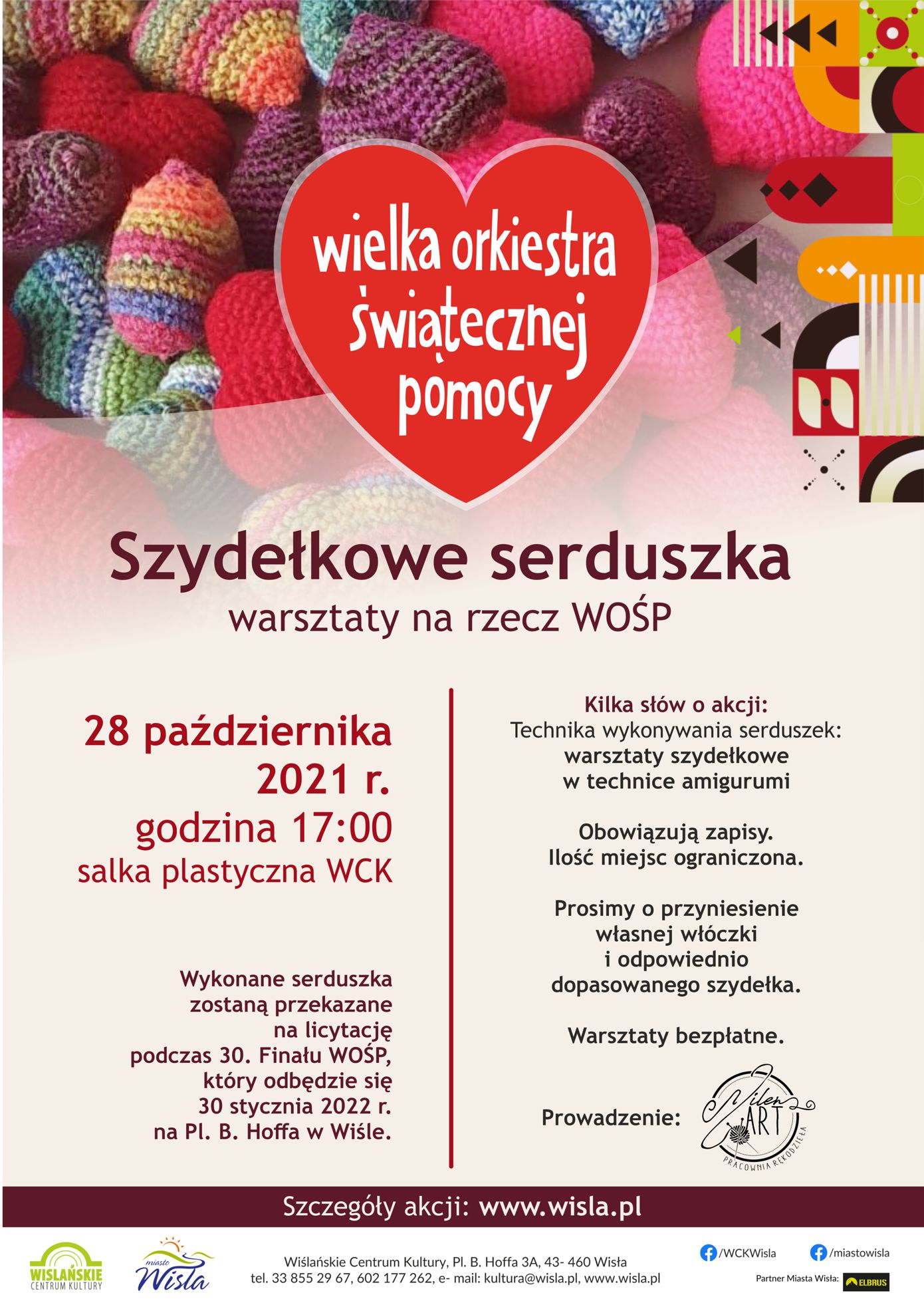 Warsztaty odbędą się 28 października o godz. 17:00 w salce plastycznej Wiślańskiego Centrum Kultury i poprowadzi je niezrównana Milenart - pracownia rękodzieła. Serduszka zostaną przekazane na licytację, która odbędzie się podczas finału Wielkiej Orkiestry Świątecznej Pomocy w w Wiśle, który odbędzie się 30 stycznia 2021. Czekamy na zgłoszenia, liczba miejsc ograniczona: kultura@wisla.pl tel. 33 855 29 67 i 602 177 262
