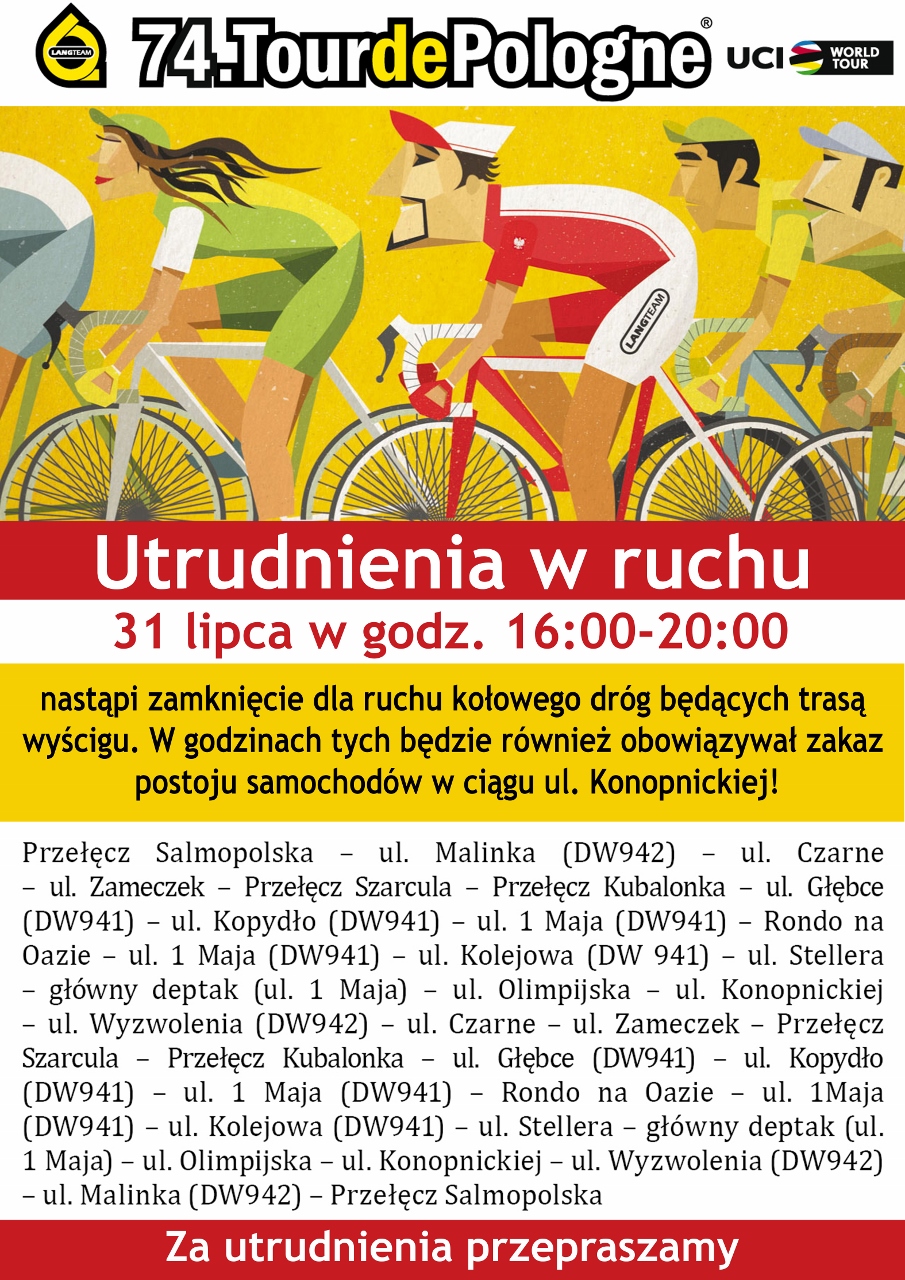 31 lipca br. przez Wisłę przejedzie wyścig kolarski 74. Tour de Pologne. W godzinach 16:00-20:00 nastąpi zamknięcie dla ruchu kołowego dróg będących trasą wyścigu.